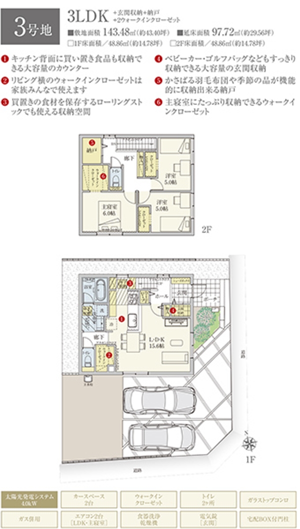 | 建物面積 | 97.72m2(3号地) | 土地面積 | 143.48m2(3号地) 私道負担なし |