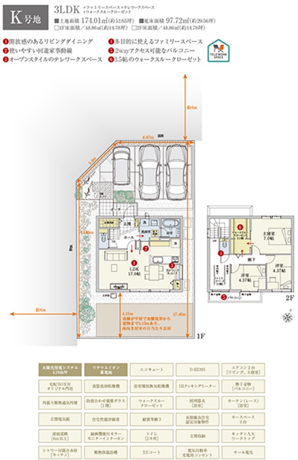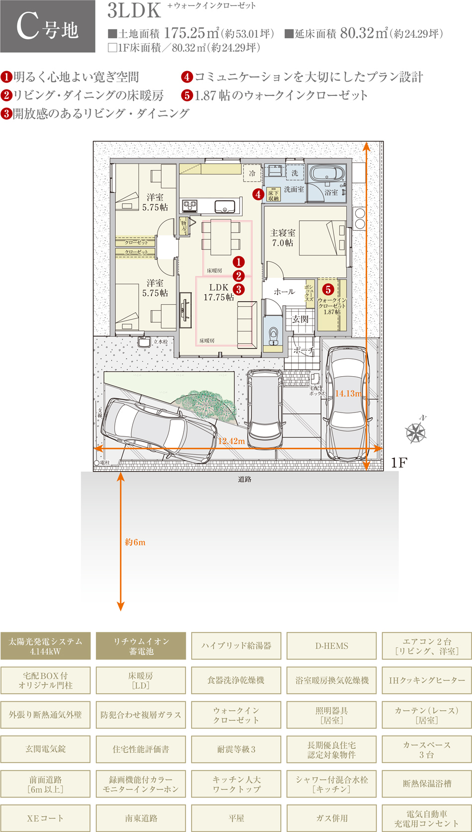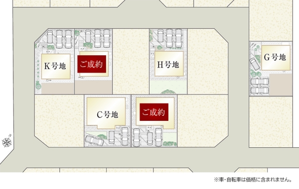 | 建物面積 | 80.32m2(C号地)、97.72m2(G号地)、97.72m2(H号地)、97.72m2(K号地) | 土地面積 | 175.25m2(C号地)、170.35m2(G号地)、174.14m2(H号地)、174.01m2(K号地) 私道負担なし |