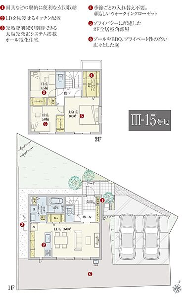 | 建物面積 | 94.40m2(III-6号地)~112.29m2(III-2号地) | 土地面積 | 165.05m2(III-10号地)~188.58m2(III-15号地) 全て私道負担なし |