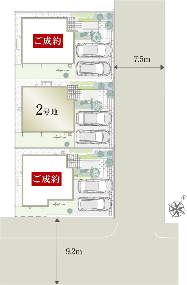 | 建物面積 | 90.25m2(2号地) | 土地面積 | 141.21m2(2号地) 私道負担なし |