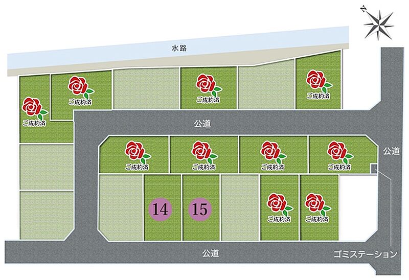 | 建物面積 | 97.72m2(14号地)、97.72m2(15号地) | 土地面積 | 127.92m2(14号地)、127.91m2(15号地) 全て私道負担なし |