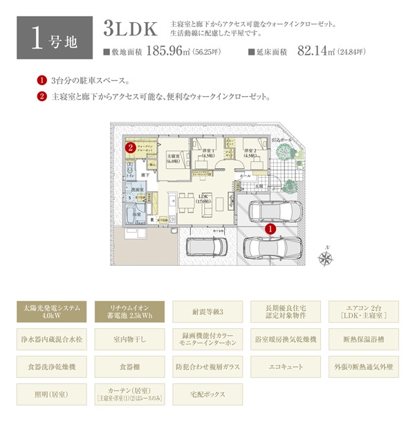 | 建物面積 | 82.14m2(1号地)、86.44m2(2号地) | 土地面積 | 185.96m2(1号地)、185.97m2(2号地) 全て私道負担なし |