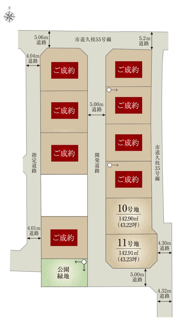 | 建物面積 | 104.66m2(10号地)、97.70m2(11号地) | 土地面積 | 142.90m2(10号地)、142.91m2(11号地) 全て私道負担なし |