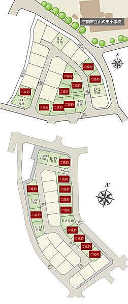 | 建物面積 | 79.98m2(E-20号地)~117.16m2(D-22号地) | 土地面積 | 159.78m2(E-8号地)~268.69m2(E-20号地) 全て私道負担なし |