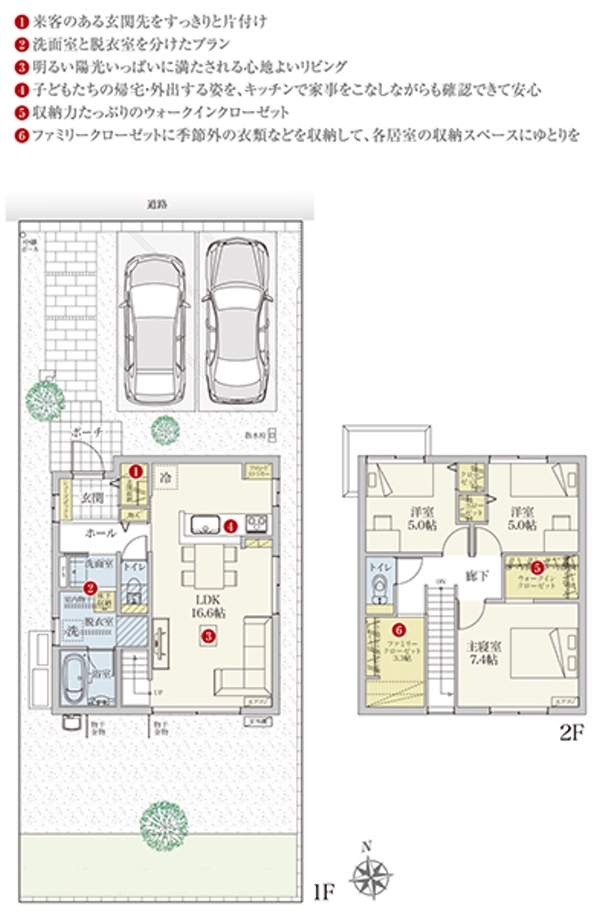 | 建物面積 | 96.89m2(2号地)、89.75m2(5号地) | 土地面積 | 166.02m2(2号地)、281.00m2(5号地) 全て私道負担なし |