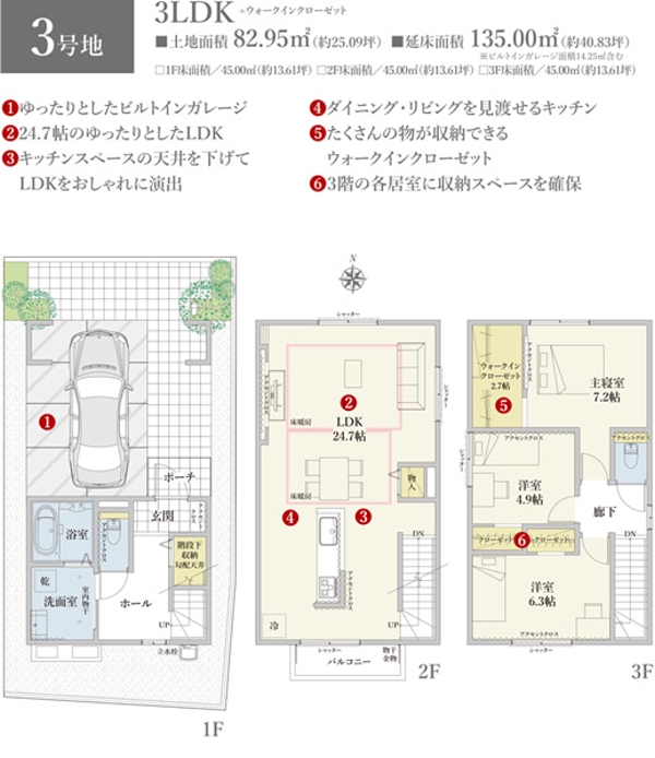 | 建物面積 | 135.00m2(3号地) | 土地面積 | 82.95m2(3号地) 私道負担なし |