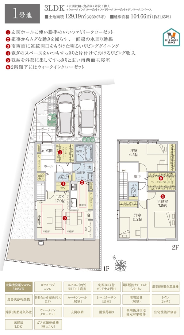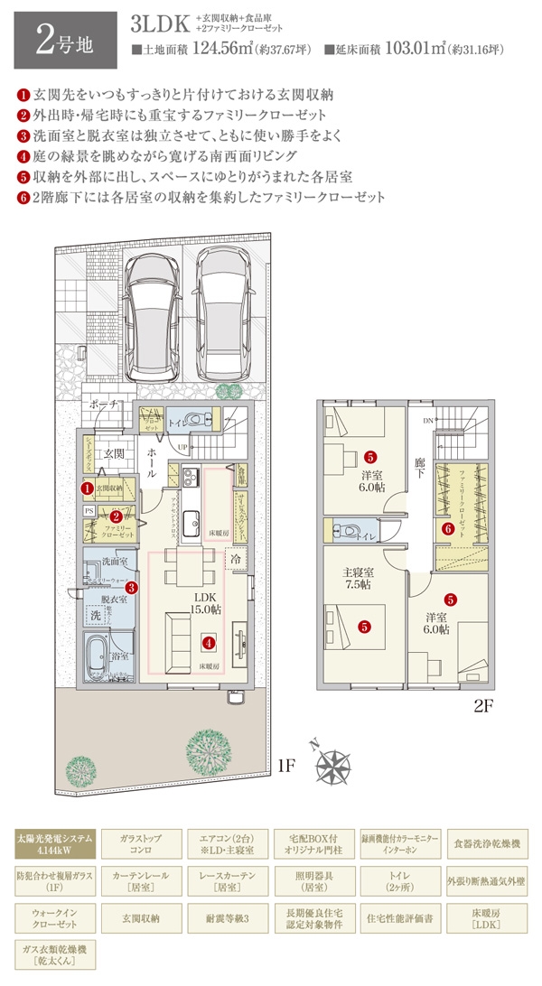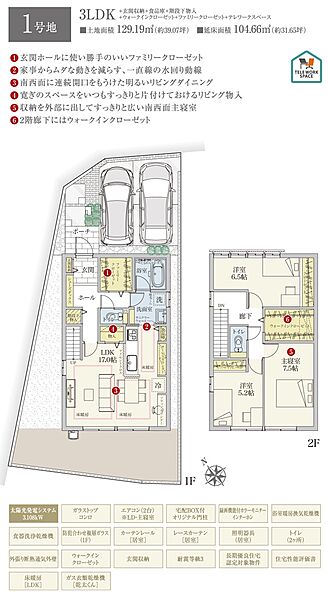 | 建物面積 | 104.66m2(1号地)、103.01m2(2号地) | 土地面積 | 129.19m2(1号地)、124.56m2(2号地) 全て私道負担なし |