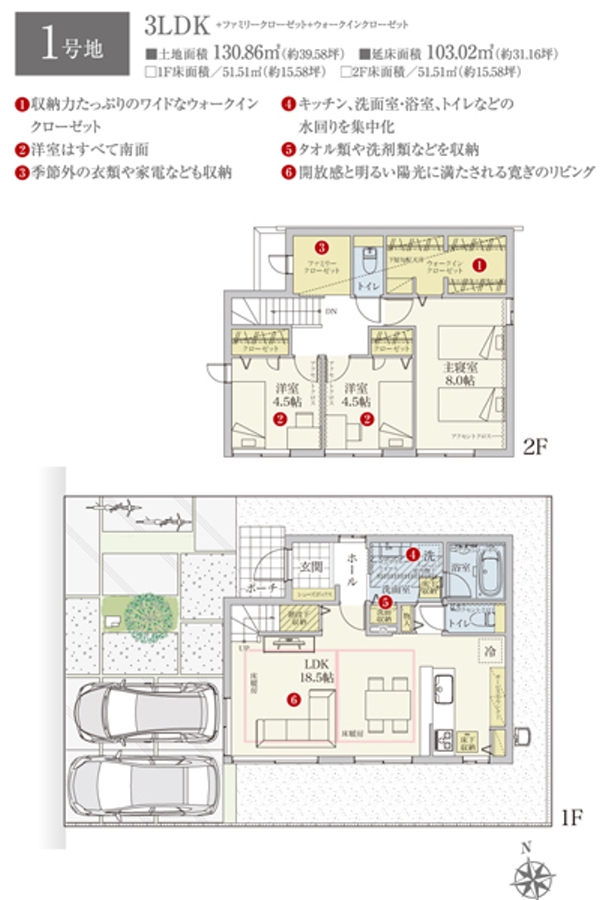 | 建物面積 | 97.70m2(2号地) | 土地面積 | 130.99m2(2号地) 私道負担なし |