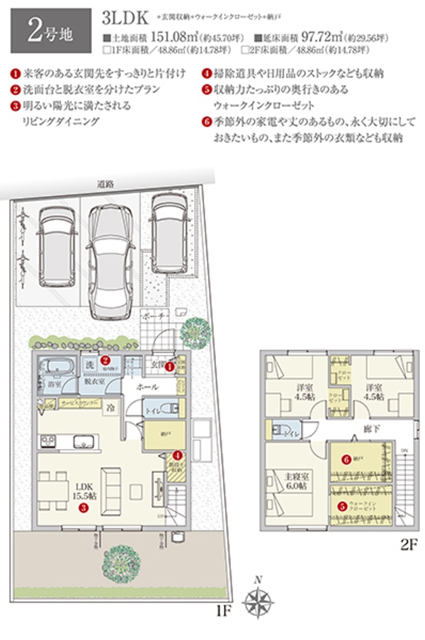 | 建物面積 | 97.72m2(2号地) | 土地面積 | 151.08m2(2号地) 私道負担なし |