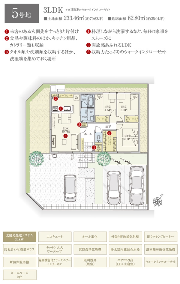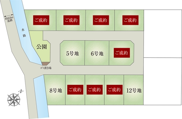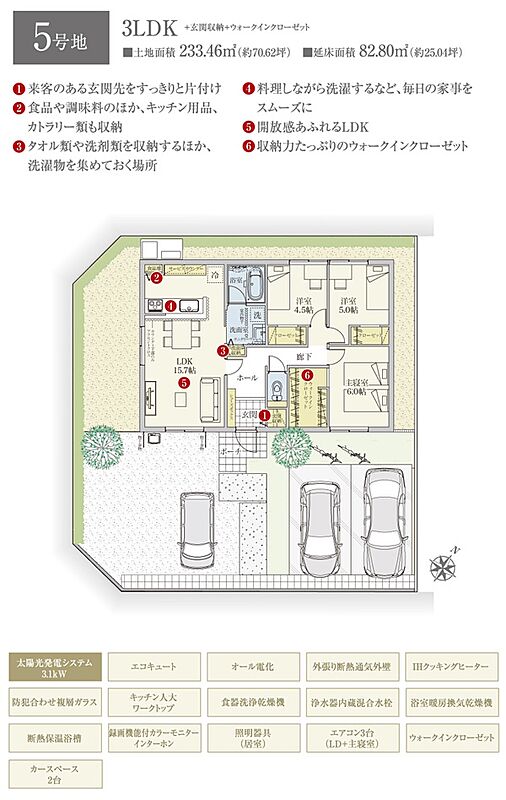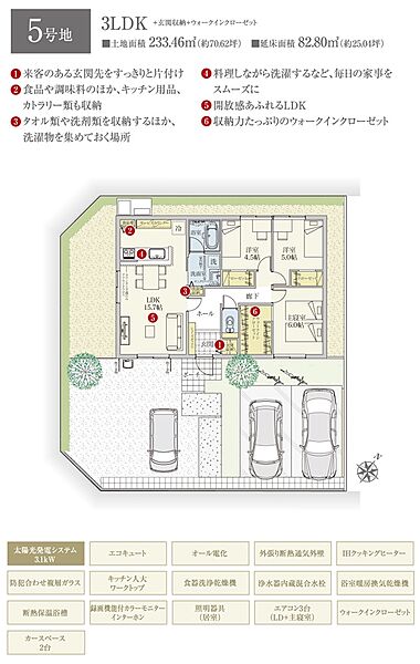 | 建物面積 | 82.80m2(5号地)、82.80m2(6号地)、106.82m2(8号地)、107.98m2(12号地) | 土地面積 | 233.46m2(5号地)、235.80m2(6号地)、232.01m2(8号地)、228.49m2(12号地) 私道負担なし |