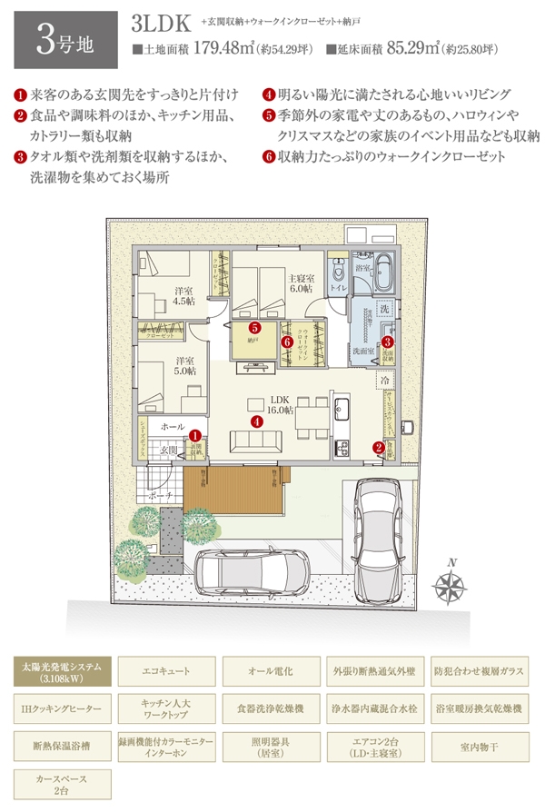 | 建物面積 | 85.29m2(3号地) | 土地面積 | 179.48m2(3号地) 私道負担なし |