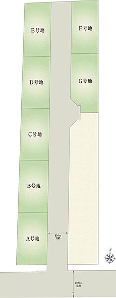 | 建物面積 | 94.40m2(B号地、C号地、D号地、E号地、F号地、G号地)~96.14m2(A号地) | 土地面積 | 119.42m2(F号地)~133.79m2(A号地) 全て私道負担なし |