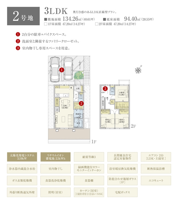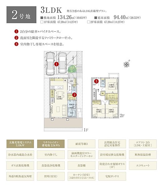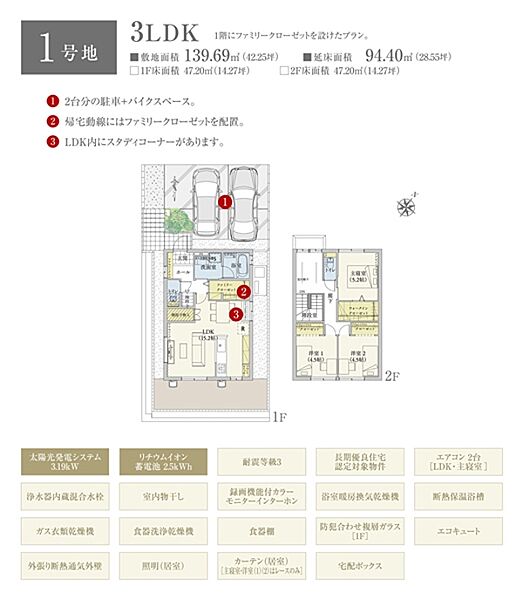 | 建物面積 | 94.40m2(1号地)、94.40m2(2号地) | 土地面積 | 139.69m2(1号地)、134.26m2(2号地) 全て私道負担なし |