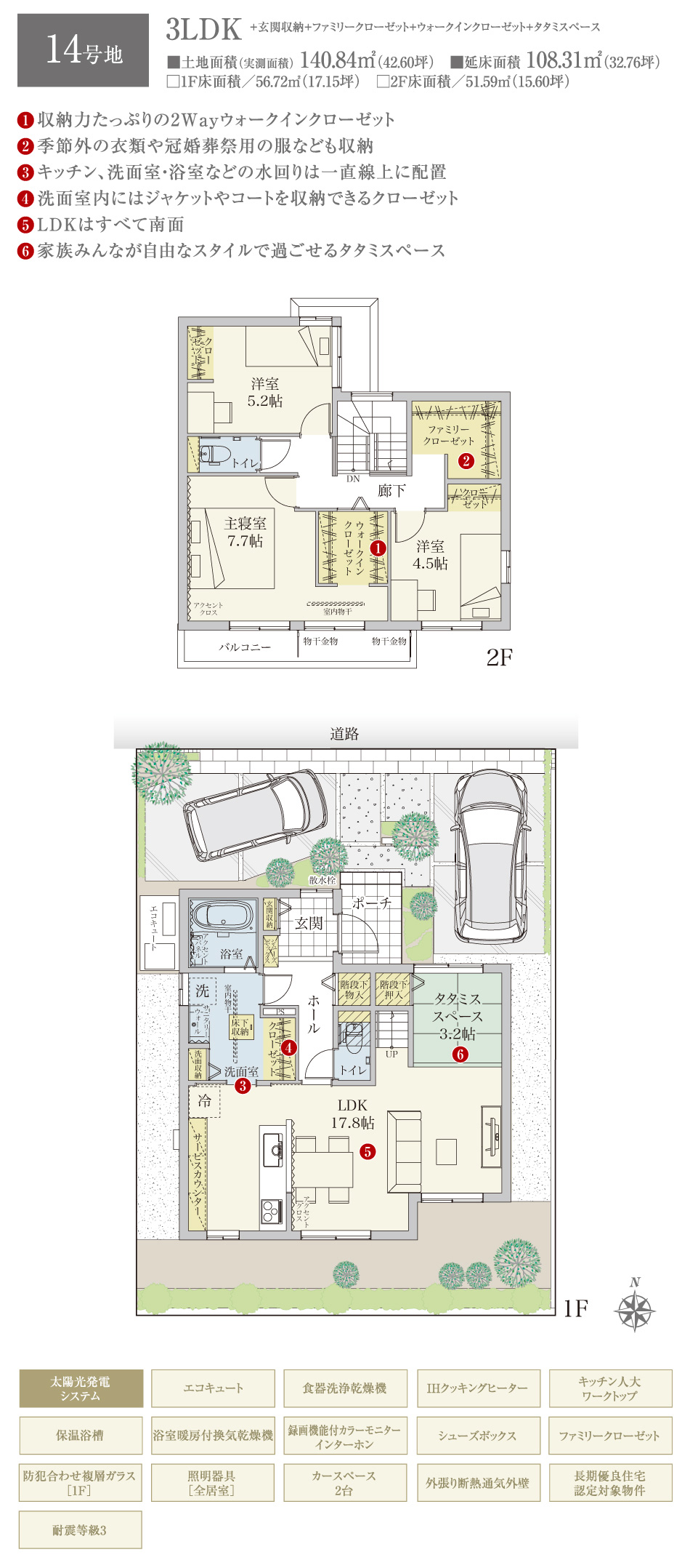 | 建物面積 | 101.52m2(13号地)、108.31m2(14号地)、106.88m2(31号地) | 土地面積 | 140.84m2(13号地)、140.84m2(14号地)、172.16m2(31号地) 私道負担なし |