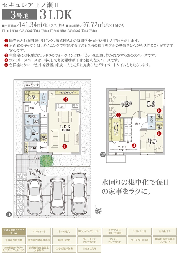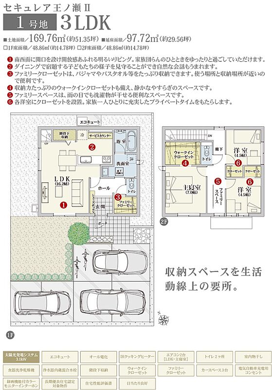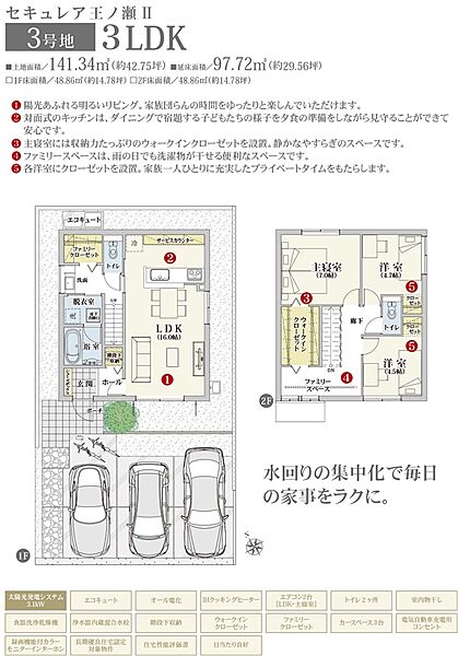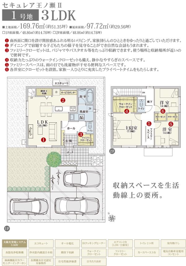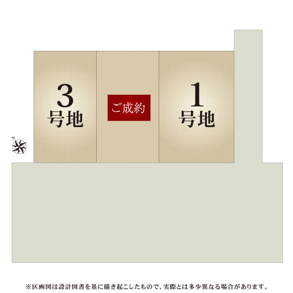 | 建物面積 | 97.72m2(1号地)、97.72m2(3号地) | 土地面積 | 169.76m2(1号地)、141.34m2(3号地) 全て私道負担なし |