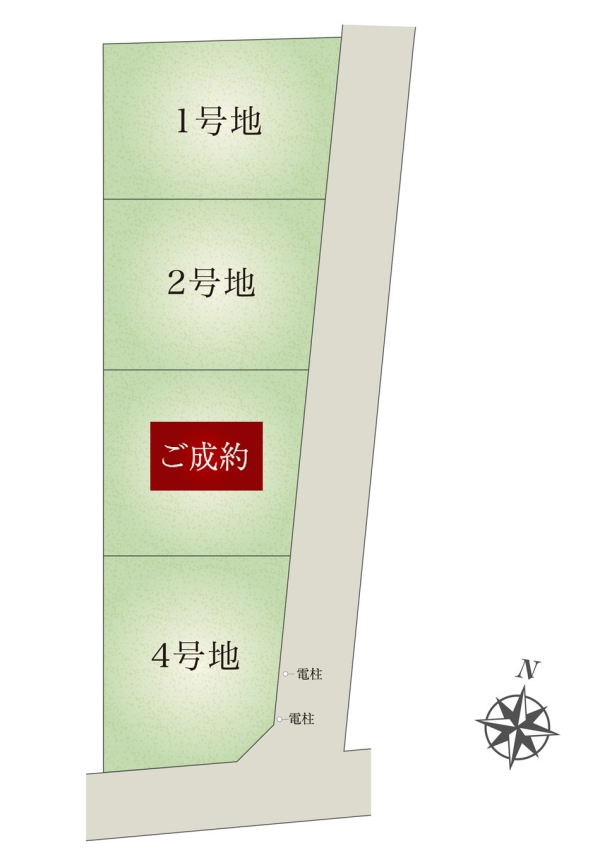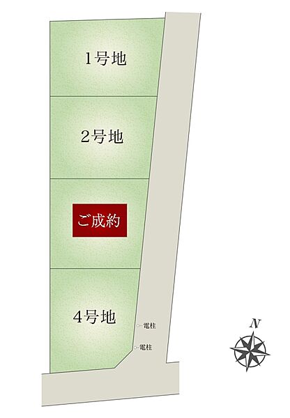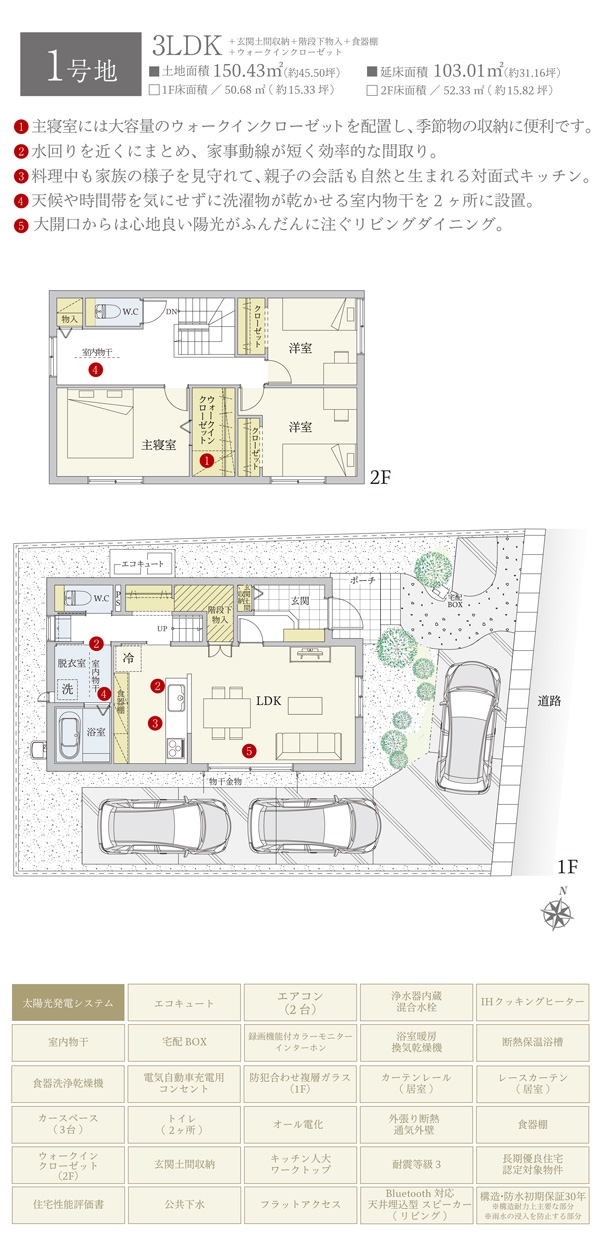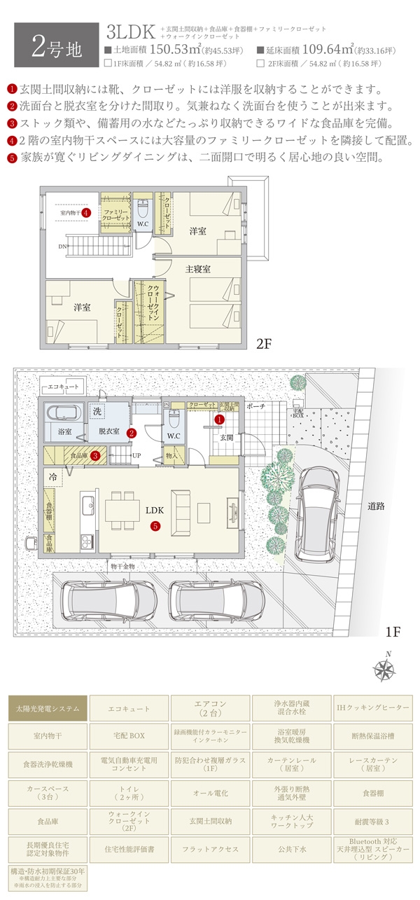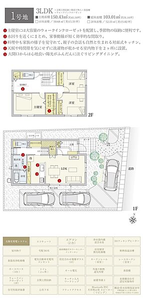 | 建物面積 | 103.01m2(1号地)、109.64m2(2号地)、109.64m2(4号地) | 土地面積 | 150.43m2(1号地)、150.53m2(2号地)、150.44m2(4号地) 私道負担なし |