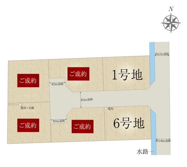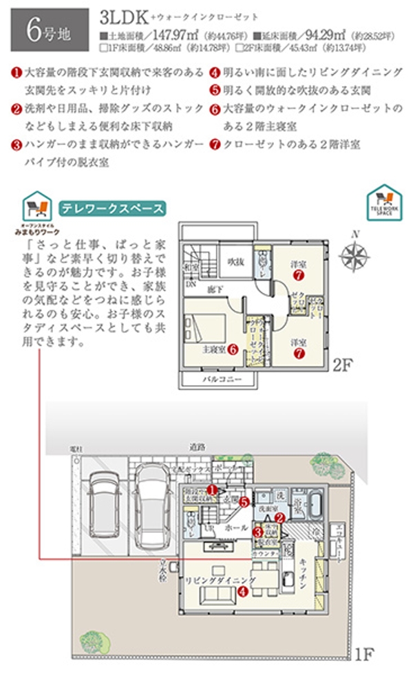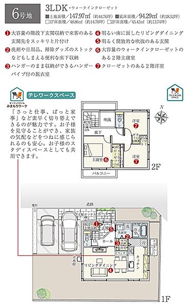 | 建物面積 | 97.72m2(1号地)、94.29m2(6号地) | 土地面積 | 149.46m2(1号地)、147.97m2(6号地) 全て私道負担なし |