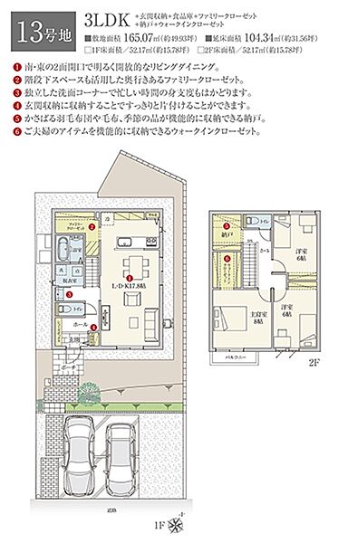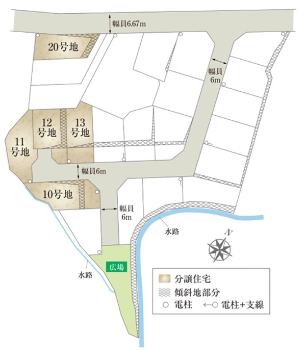 | 建物面積 | 97.70m2(10号地)、91.08m2(11号地)、102.68m2(12号地)、104.34m2(13号地)、97.70m2(20号地) | 土地面積 | 184.44m2(10号地)、168.56m2(11号地)、165.07m2(12号地)、165.07m2(13号地)、165.15m2(20号地) 私道負担なし |
