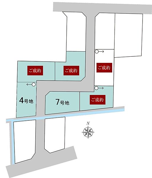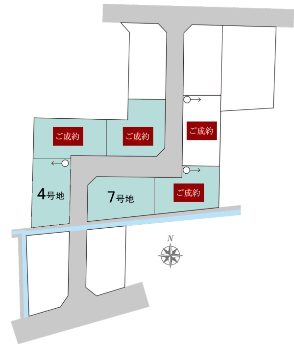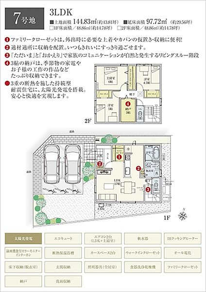 | 建物面積 | 102.68m2(4号地)、97.72m2(7号地) | 土地面積 | 138.75m2(4号地)、144.83m2(7号地) 全て私道負担なし |
