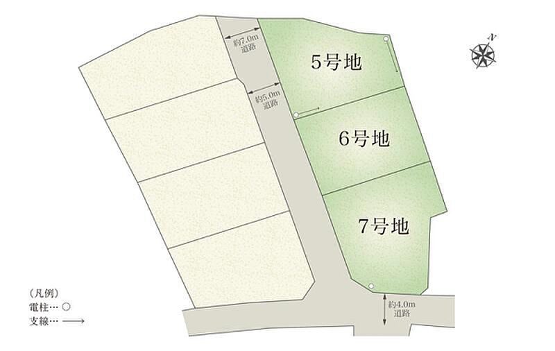 | 間取り | 3LDK(5号地、6号地)、4LDK(7号地) | 建物構造 | 軽量鉄骨1階建(1戸)、軽量鉄骨2階建(2戸) |