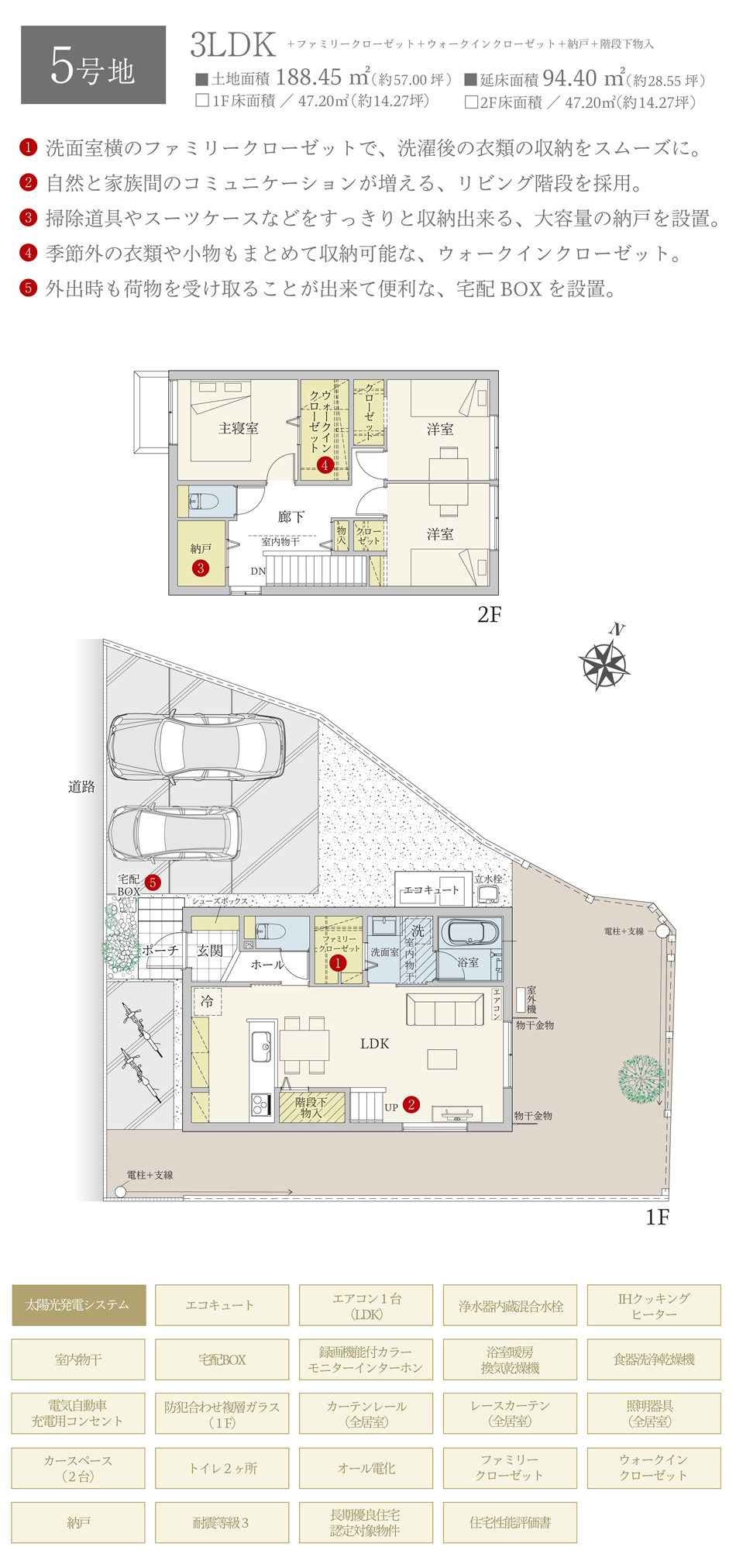 | 建物面積 | 94.40m2(5号地)、76.01m2(6号地)、97.72m2(7号地) | 土地面積 | 188.45m2 私道負担あり 176m2のうち、7分の1の負担持分(5号地)、168.11m2 私道負担あり 176m2のうち、7分の1の負担持分(6号地)、183.09m2 私道負担あり 176m2のうち、7分の1の負担持分(7号地) |