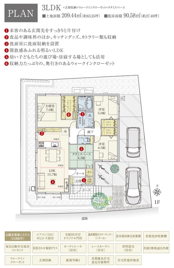 | 建物面積 | 90.58m2(1号地) | 土地面積 | 209.44m2(1号地) 私道負担なし |