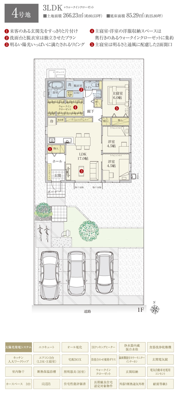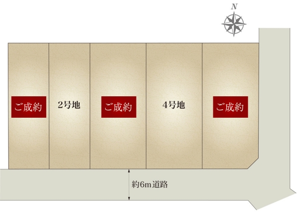 | 建物面積 | 104.66m2(2号地)、85.29m2(4号地) | 土地面積 | 192.64m2(2号地)、266.23m2(4号地) 全て私道負担なし |