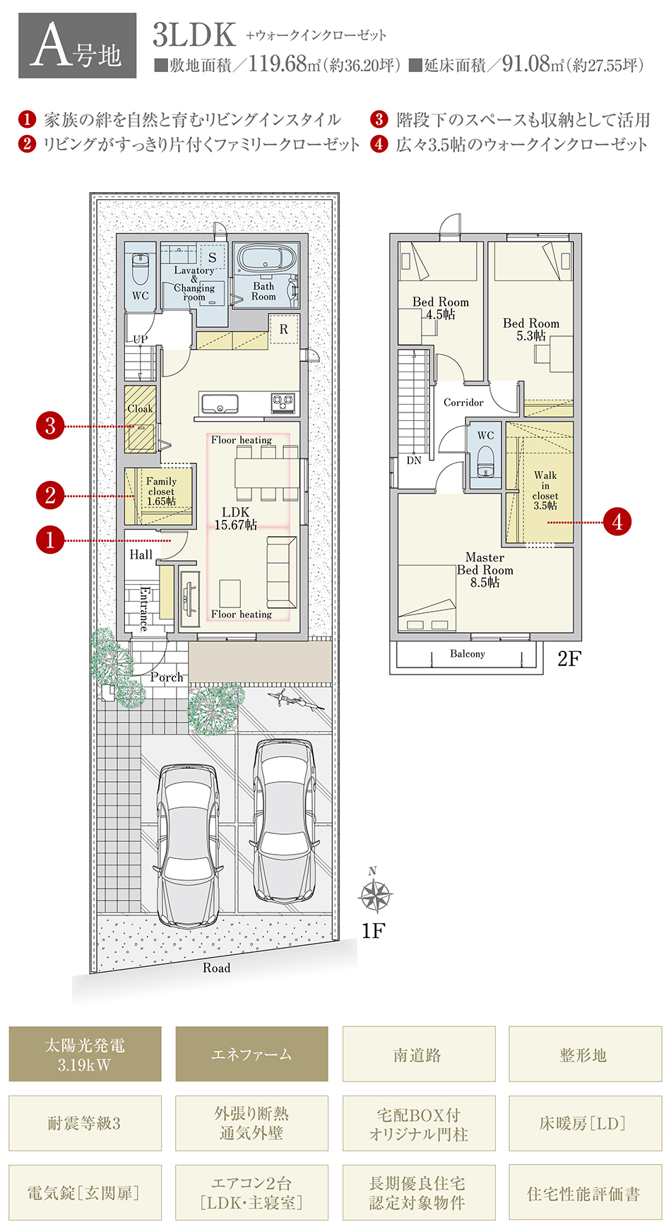 | 建物面積 | 91.08m2(A号地) | 土地面積 | 119.68m2(A号地) 私道負担なし |