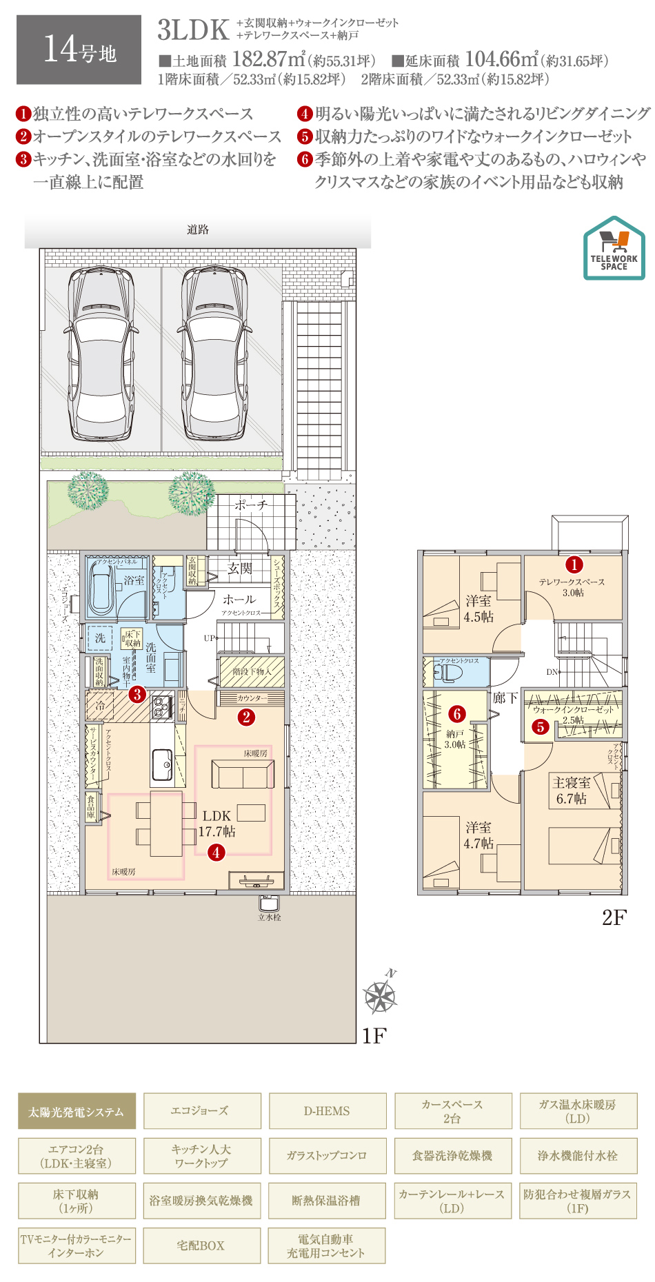 | 建物面積 | 104.66m2(14号地) | 土地面積 | 182.87m2(14号地) 私道負担なし |