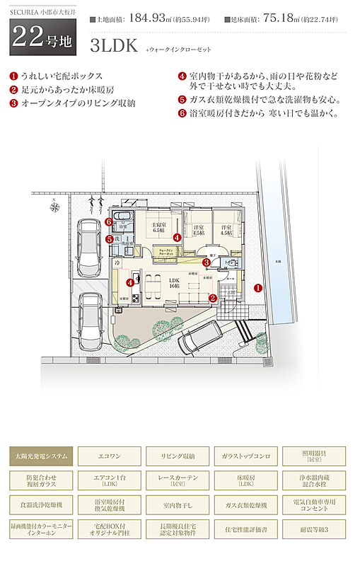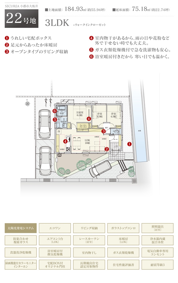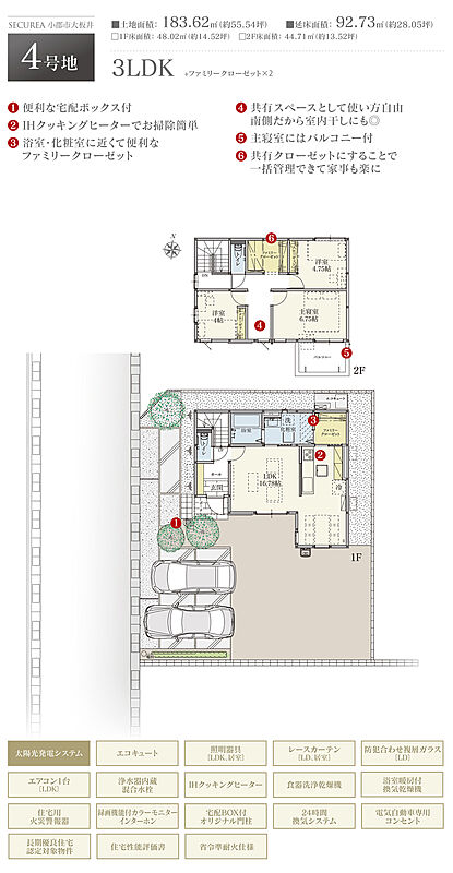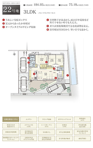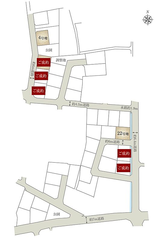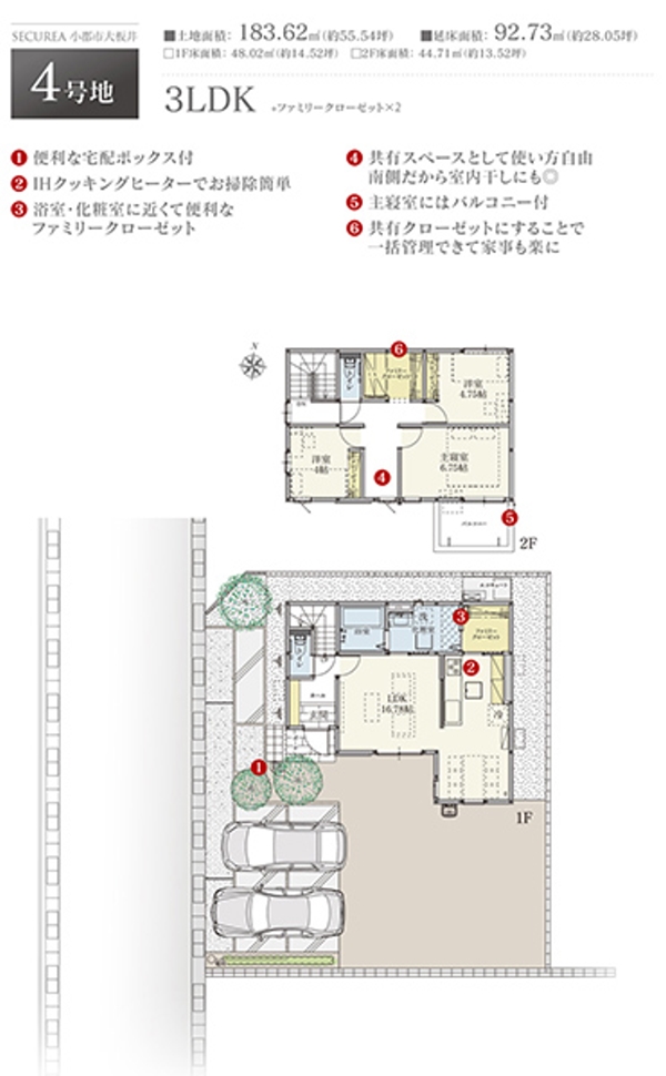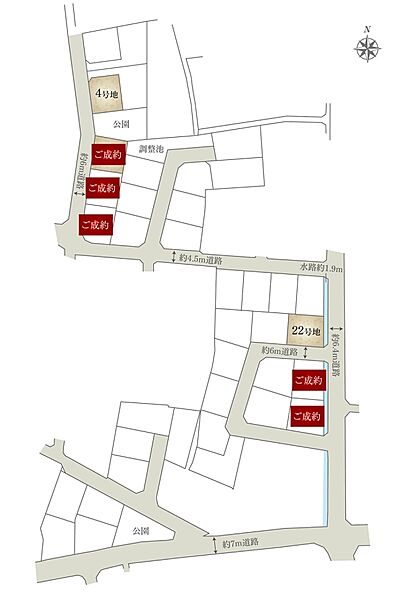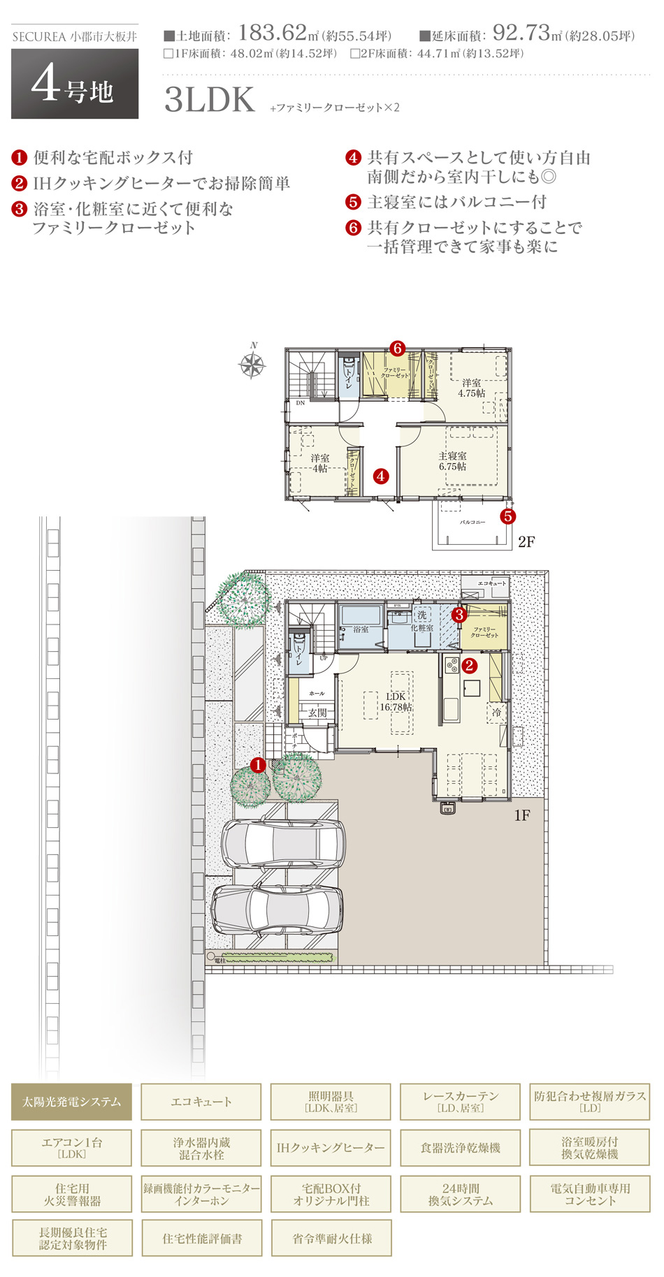 | 建物面積 | 92.73m2(4号地)、75.18m2(22号地) | 土地面積 | 183.62m2(4号地)、184.93m2(22号地) 全て私道負担なし |