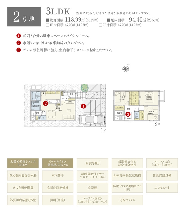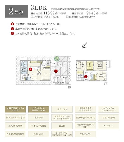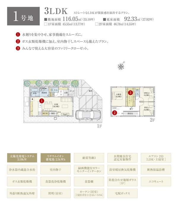 | 建物面積 | 92.33m2(1号地)、94.40m2(2号地)、94.40m2(3号地) | 土地面積 | 116.05m2(1号地)、118.99m2(2号地)、118.88m2(3号地) 私道負担なし |