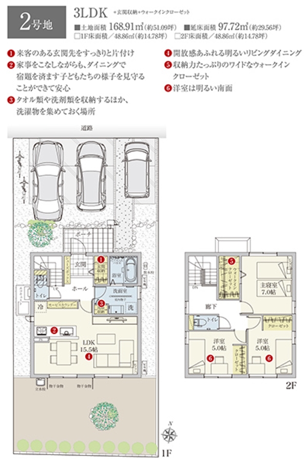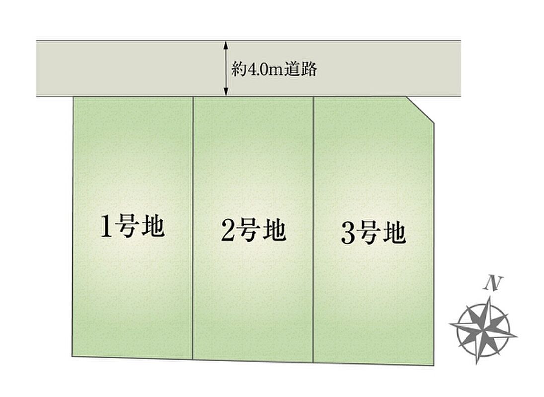 | 建物面積 | 96.86m2(1号地)、97.72m2(2号地)、97.72m2(3号地) | 土地面積 | 166.98m2(1号地)、168.91m2(2号地)、168.44m2(3号地) 私道負担なし |