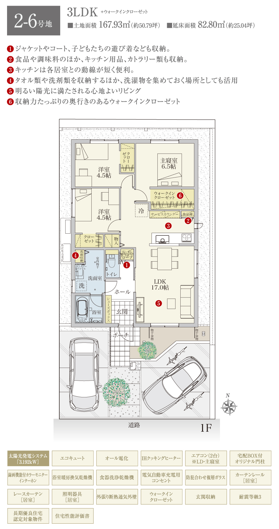 | 建物面積 | 82.80m2(2-6号地)、82.80m2(2-8号地)、96.72m2(5-4号地) | 土地面積 | 167.93m2(2-6号地)、167.92m2(2-8号地)、167.96m2(5-4号地) 私道負担なし |
