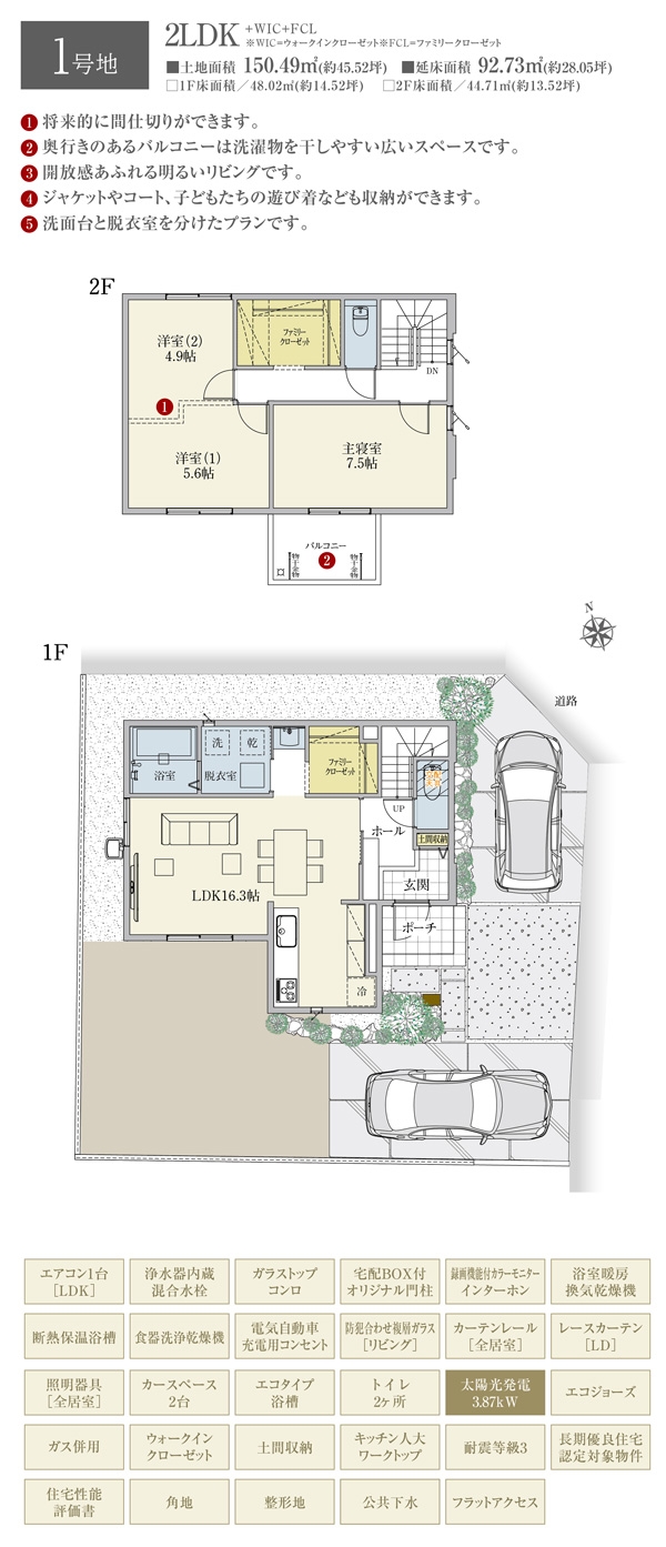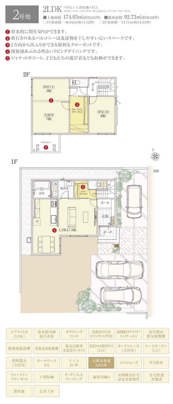 | 建物面積 | 92.73m2(2号地) | 土地面積 | 174.03m2(2号地) 私道負担なし |