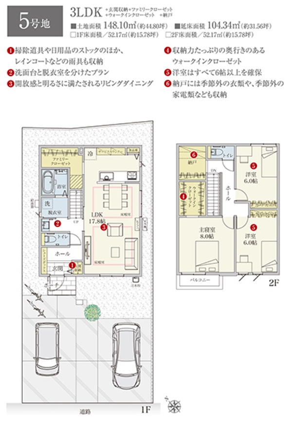 | 建物面積 | 102.68m2(1号地)、102.68m2(4号地)、104.34m2(5号地) | 土地面積 | 160.02m2(1号地)、147.23m2(4号地)、148.10m2(5号地) 私道負担なし |