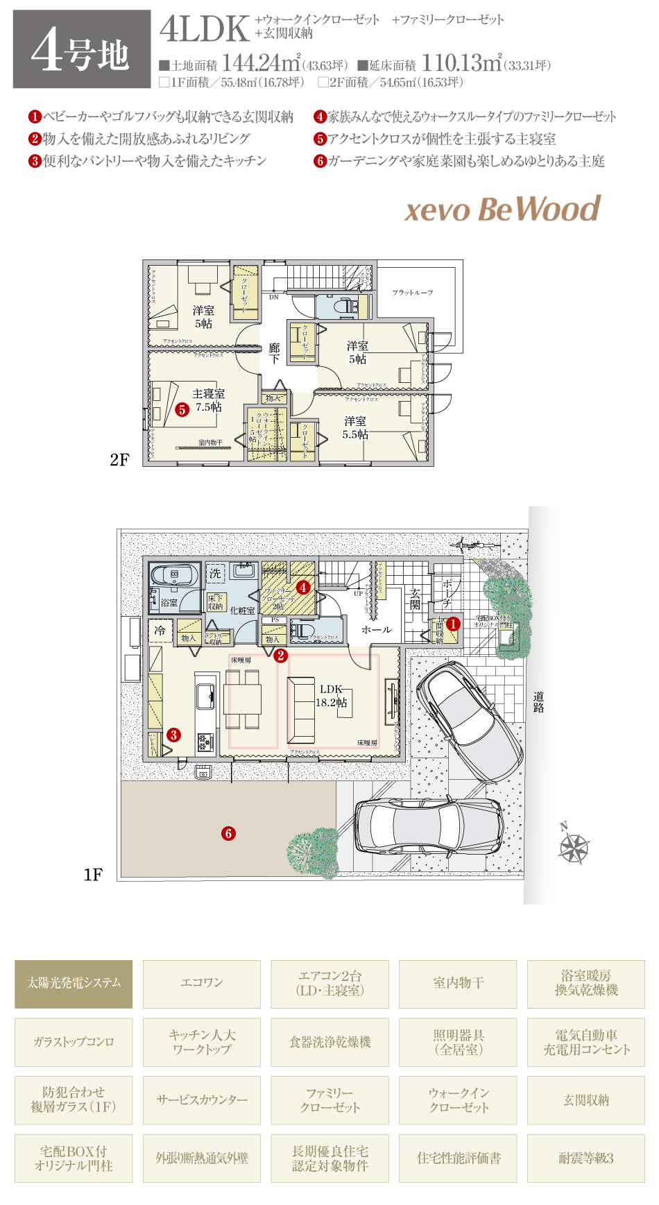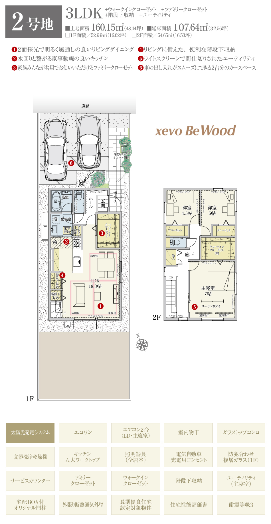 | 建物面積 | 107.64m2(2号地)、110.13m2(4号地) | 土地面積 | 160.15m2(2号地)、144.24m2(4号地) 全て私道負担なし |