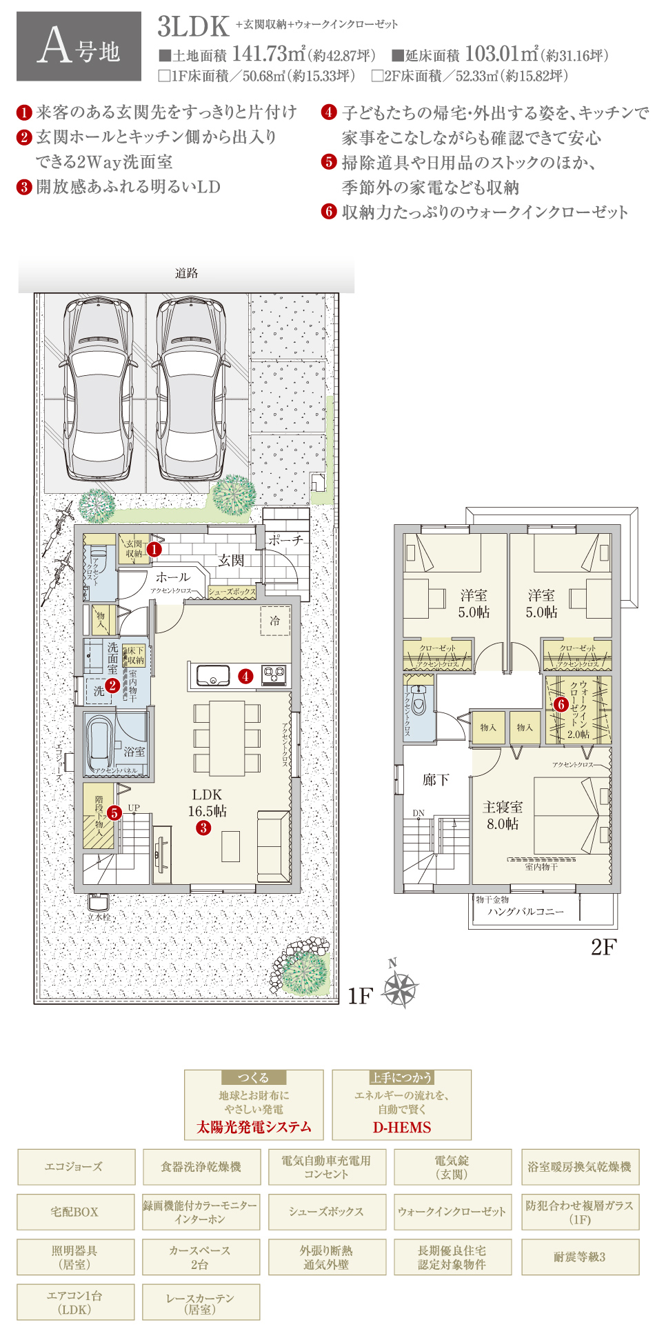 | 建物面積 | 103.01m2(A号地)、103.01m2(C号地)、103.01m2(D号地)、104.66m2(E号地)、106.32m2(F号地) | 土地面積 | 141.73m2(A号地)、141.69m2(C号地)、141.67m2(D号地)、141.65m2(E号地)、141.63m2(F号地) 私道負担なし |