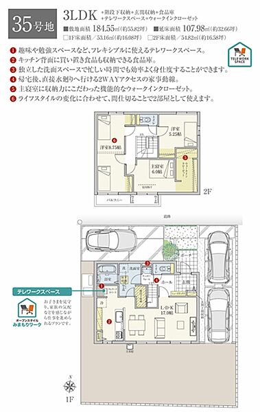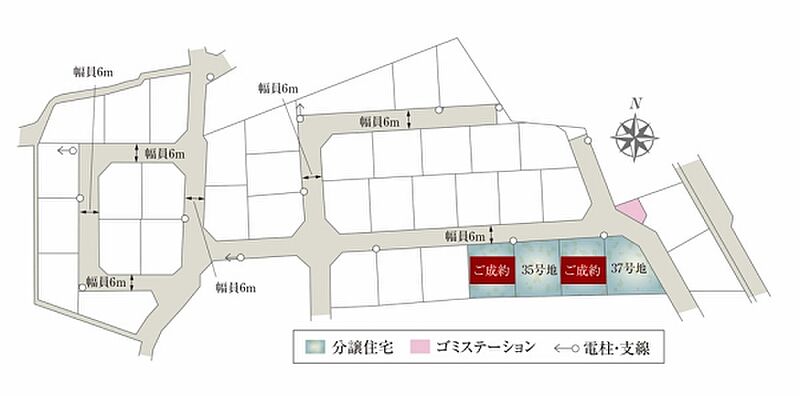 | 建物面積 | 107.98m2(35号地)、106.32m2(37号地) | 土地面積 | 184.55m2(35号地)、184.60m2(37号地) 全て私道負担なし |