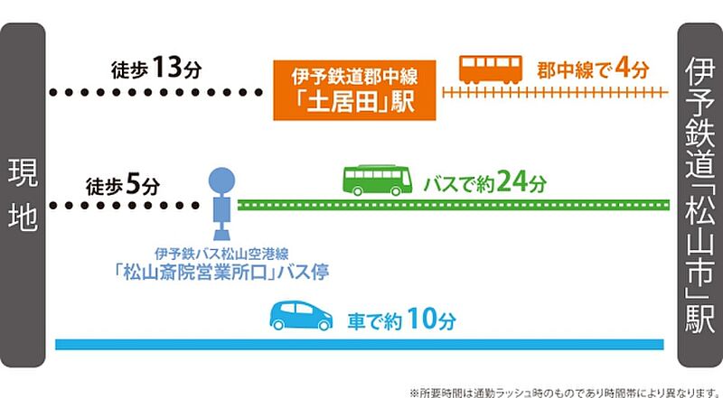 伊予鉄道郡中線「土居田」駅 徒歩13分~13分 伊予鉄道郡中線「松山市」駅 徒歩49分~50分 |