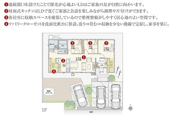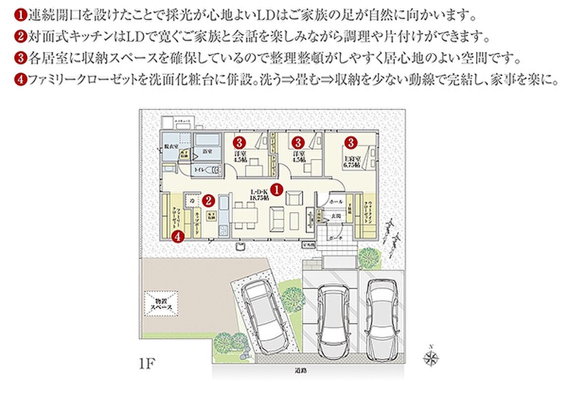 分譲地内は公園とゴミ集積所が整えられ、前面道路は幅員6mとなっており車のすれ違いもスムーズにできます。