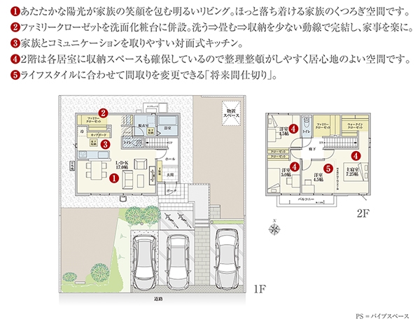 | 建物面積 | 79.08m2(29-17号地)、102.68m2(32-16号地)、92.73m2(38-2号地)、104.33m2(40-4号地) | 土地面積 | 229.21m2(29-17号地)、234.78m2(32-16号地)、230.87m2(38-2号地)、246.88m2(40-4号地) 私道負担なし |