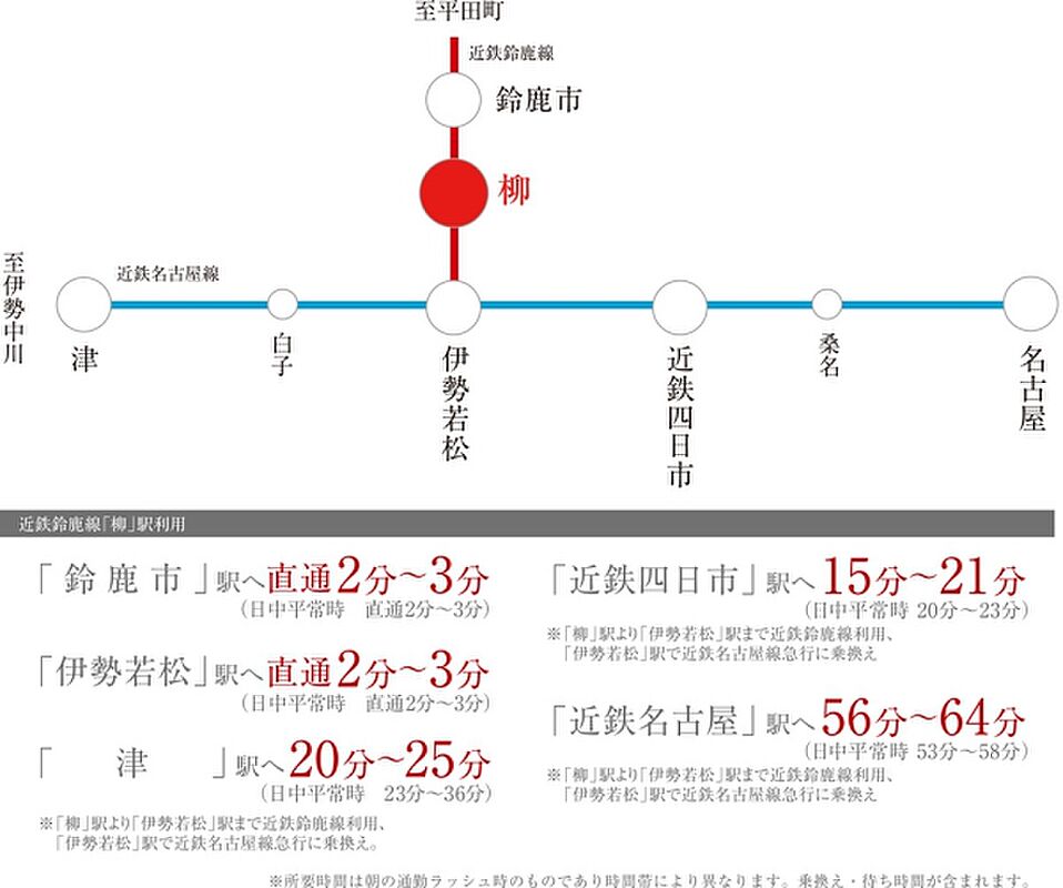近鉄鈴鹿線「柳」駅 徒歩25分~25分 伊勢鉄道「鈴鹿」駅 徒歩28分~28分 |