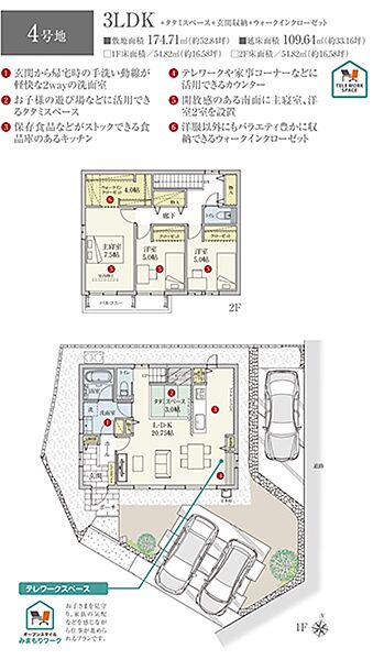 | 建物面積 | 109.64m2(4号地) | 土地面積 | 174.71m2(4号地) 私道負担なし |