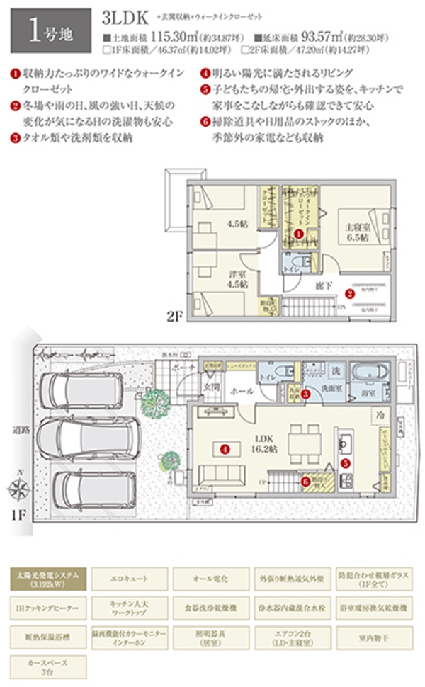 | 建物面積 | 93.57m2(1号地) | 土地面積 | 115.30m2(1号地) 私道負担なし |