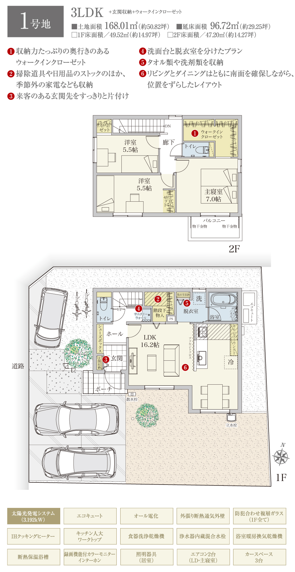 | 建物面積 | 96.72m2(1号地) | 土地面積 | 168.01m2(1号地) 私道負担なし |