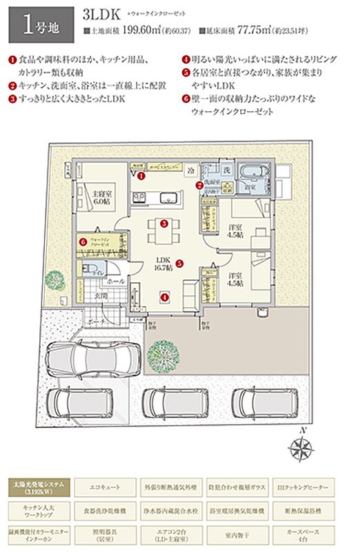 | 建物面積 | 77.75m2(1号地) | 土地面積 | 199.60m2(1号地) 私道負担なし |
