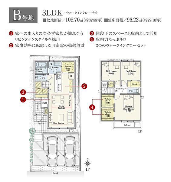 | 建物面積 | 96.22m2(B号地) | 土地面積 | 108.70m2(B号地) 私道負担なし |