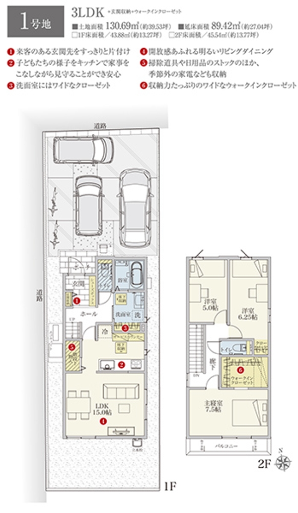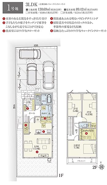 | 建物面積 | 89.42m2(1号地) | 土地面積 | 130.69m2(1号地) 私道負担なし |