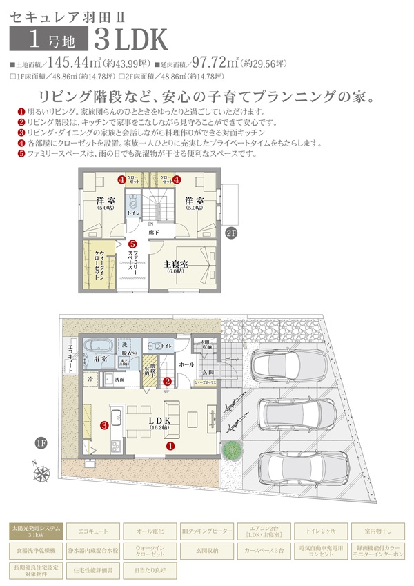 | 建物面積 | 97.72m2(1号地) | 土地面積 | 145.44m2(1号地) 私道負担なし |