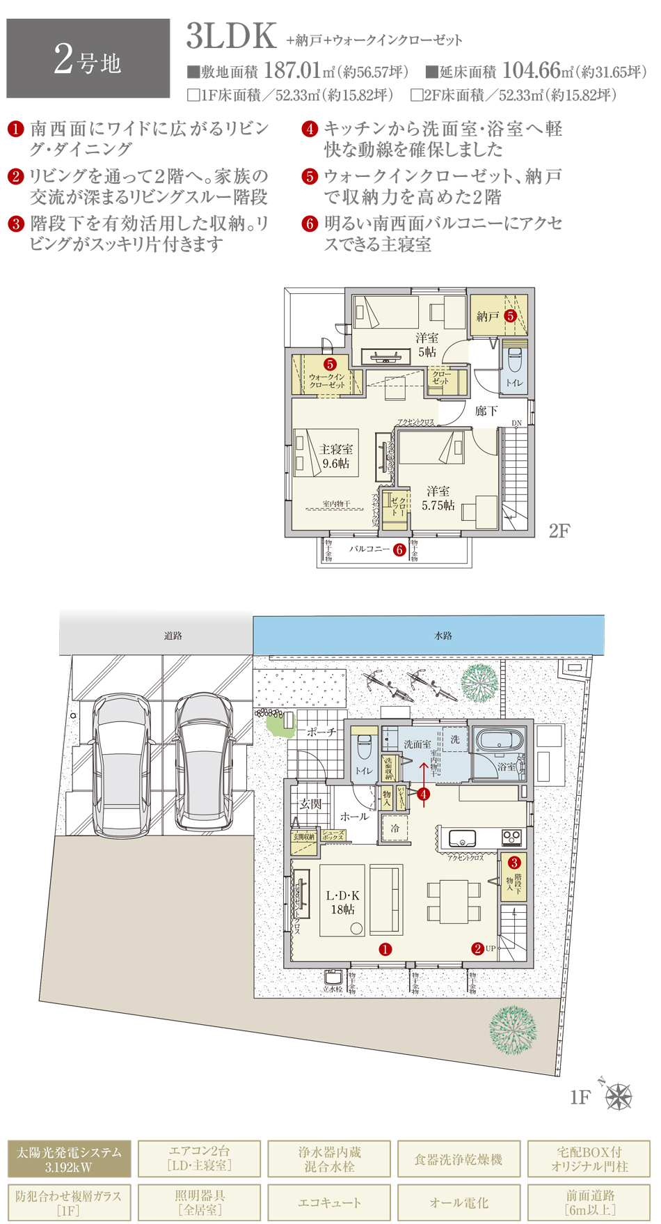 | 建物面積 | 104.66m2(2号地) | 土地面積 | 187.01m2(2号地) 私道負担なし |